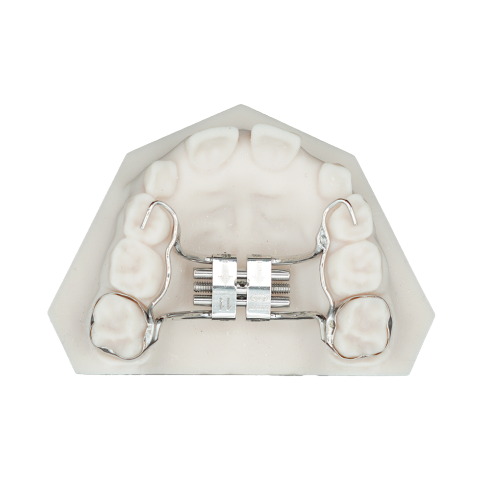 L’appareil d’expansion palatine permet de corriger un déficit de largeur au niveau du maxillaire supérieur, créant l’espace nécessaire pour un alignement correct des dents permanentes. L’âge idéal pour l’expansion se situe entre 8 et 10 ans, lorsque les sutures palatines sont encore flexibles. Il est possible de l’utiliser jusqu’à environ 15 ans, mais au-delà, la suture se fusionne progressivement, et une intervention chirurgicale peut être nécessaire. Ce dispositif aide non seulement à prévenir les chevauchements dentaires, mais contribue également à améliorer la respiration, l’occlusion et l’équilibre facial global.